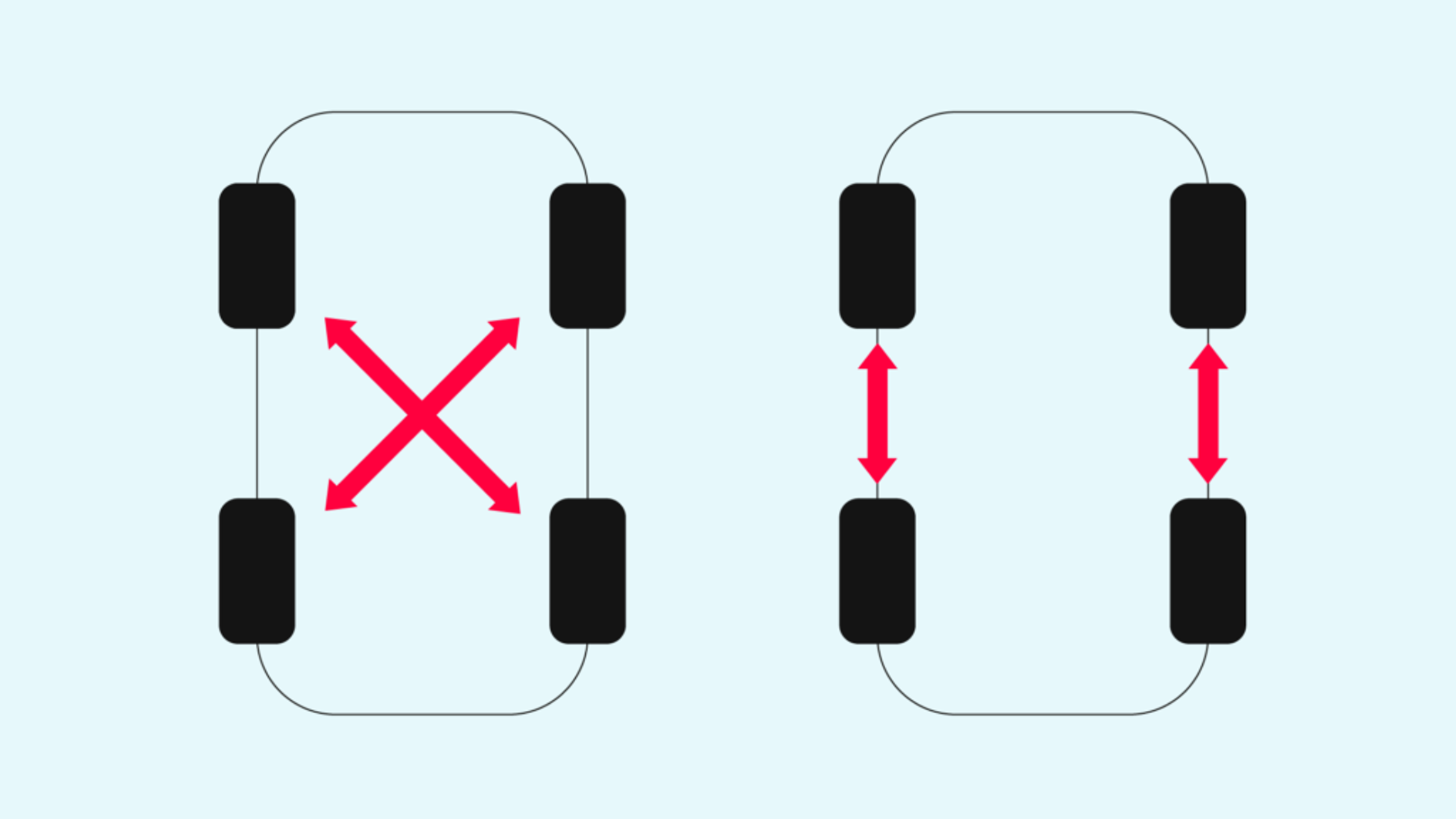 Some high-performance vehicles are equipped with differently-sized wheels on the front and rear axles to improve acceleration and cornering. In this case, you have to use the side-to-side pattern. Bear in mind this pattern only works with non-directional tires, otherwise you’ll have to remount them on rims on the opposite side.