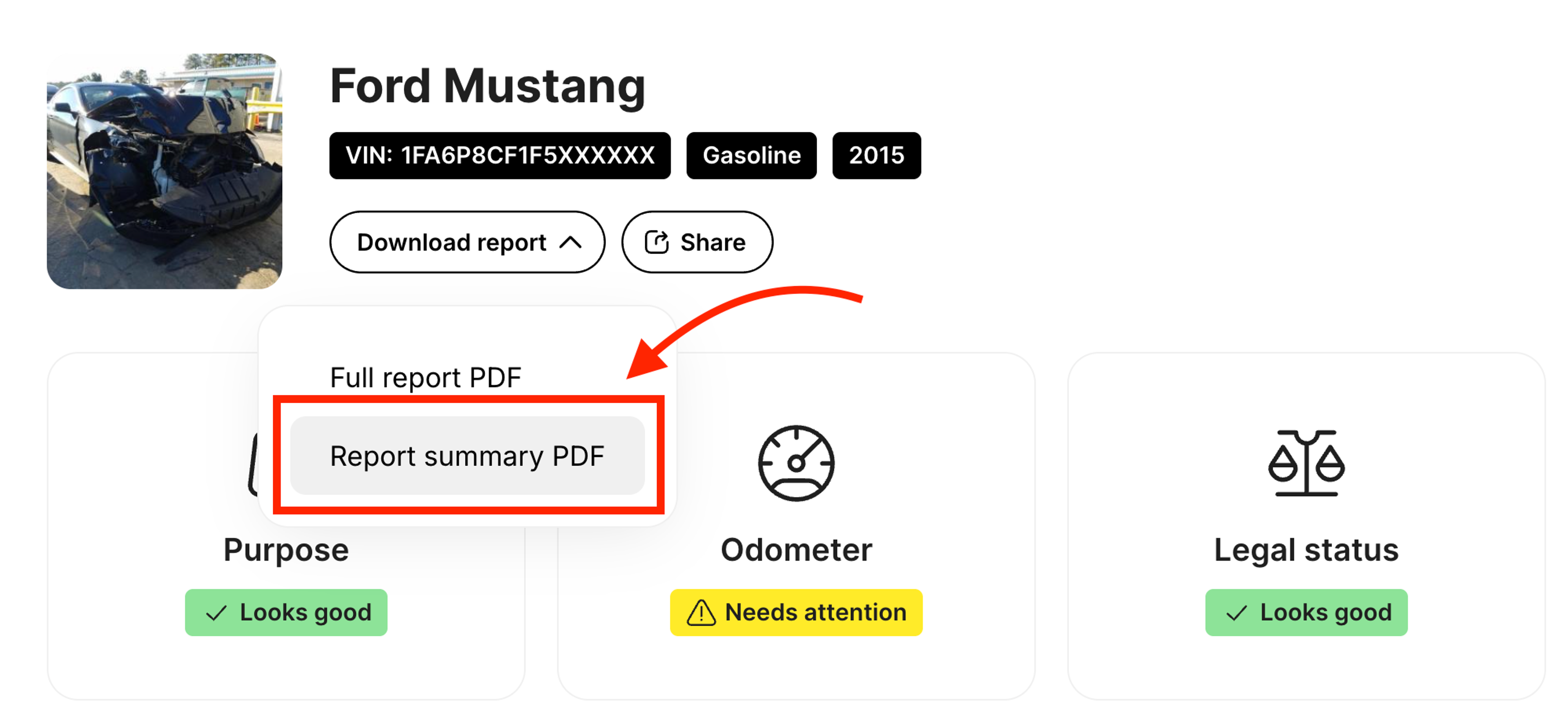 You can now choose whether to download the full report or get a summary. It includes only what matters most to your customers: specs, damage records, theft status, odometer readings – all on one easy-to-share page.