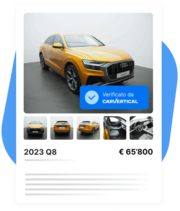 carVertical controlla oltre un miliardo di documenti per aiutarvi a ridurre il rischio di acquisti sbagliati, proteggere i vostri margini e rendere i vostri annunci più interessanti perché corredati da documenti affidabili.