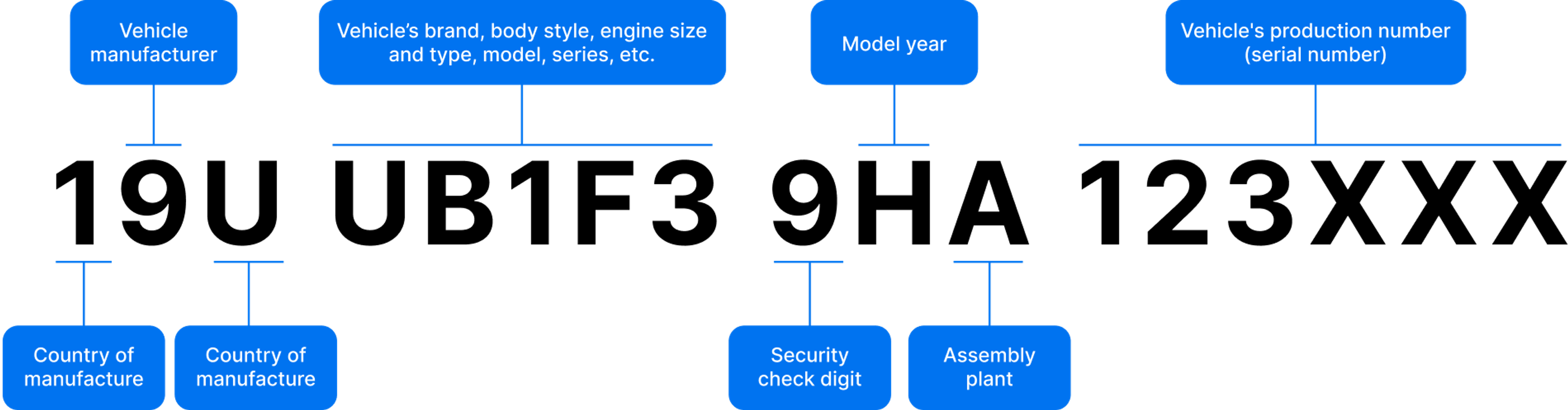 Each Acura VIN has four sections: World Manufacturer Identifier (WMI), Vehicle Descriptor Section (VDS), Security Check Digit, and Vehicle Identifier Section (VIS). Each part spills the details about the car, giving you a clear picture of the chosen specs.