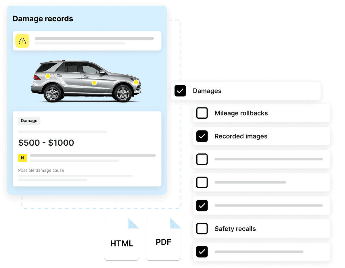 Our tailored API solutions offer a wide range of options to customize vehicle history reports according to your preferences. The vehicle history report can be easily presented as a dynamic web page or downloaded as a precisely formatted PDF, making it easy to access, share, and review.
