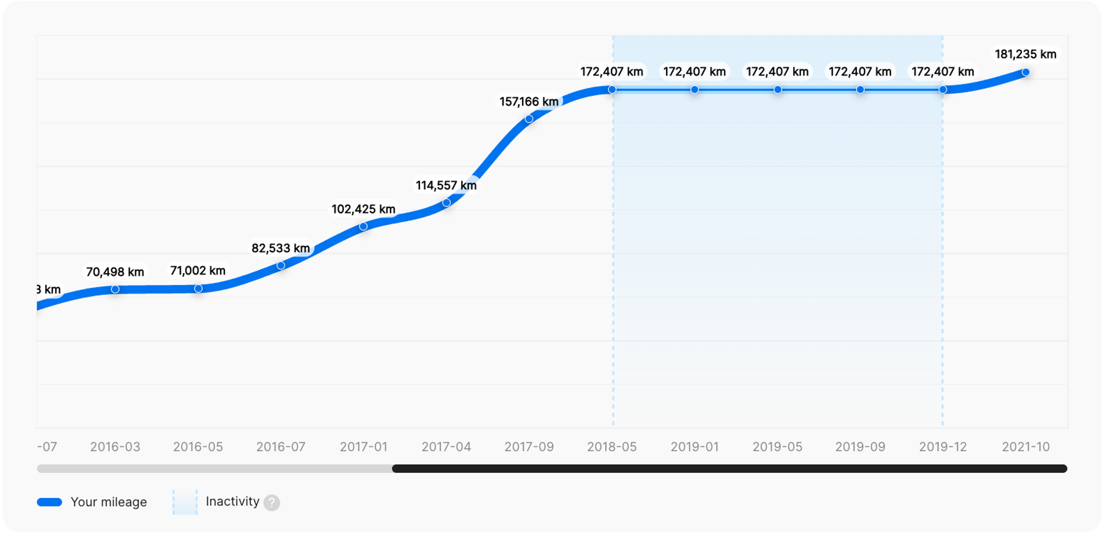 Hovering over a specific segment of the mileage timeline shows the average monthly distance the car traveled during that period.