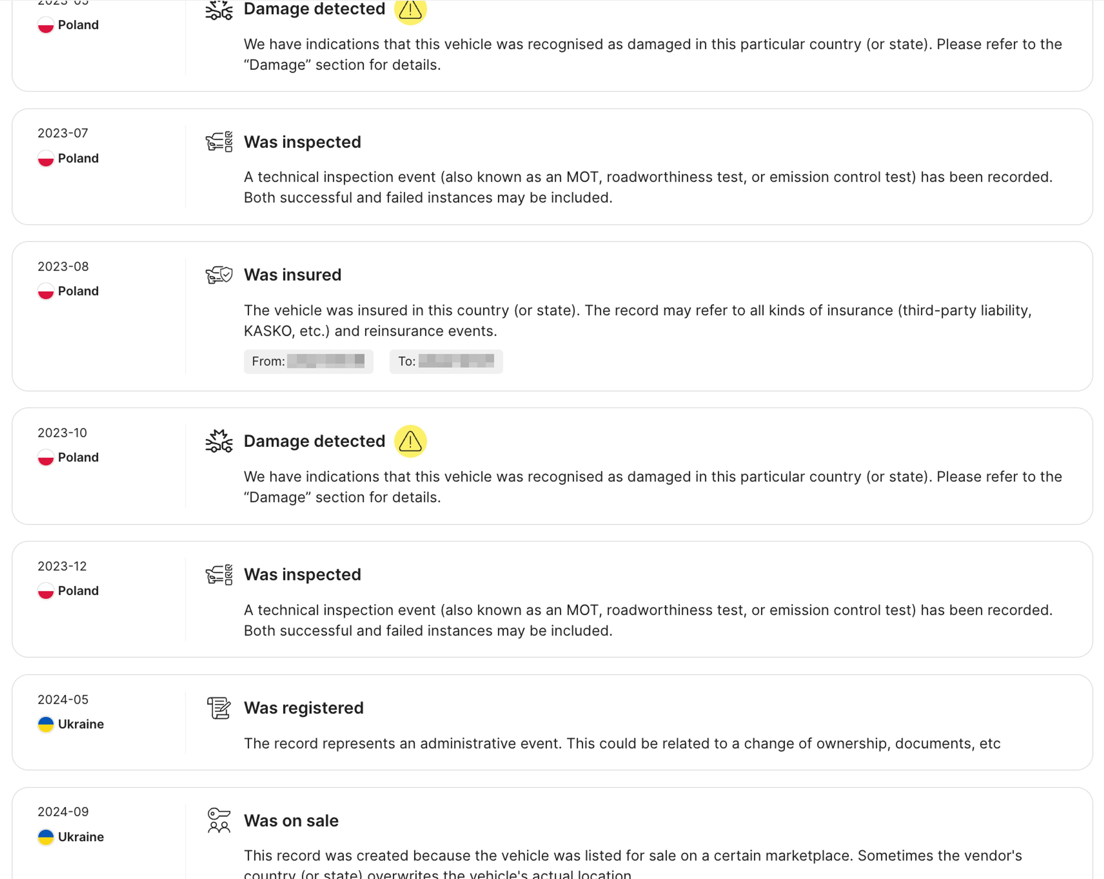 The vehicle’s timeline may appear incomplete if certain service providers or owners did not document specific vehicle-related events, so they aren’t available in official databases. Gaps can also occur depending on location, as some data may not be available in certain countries.